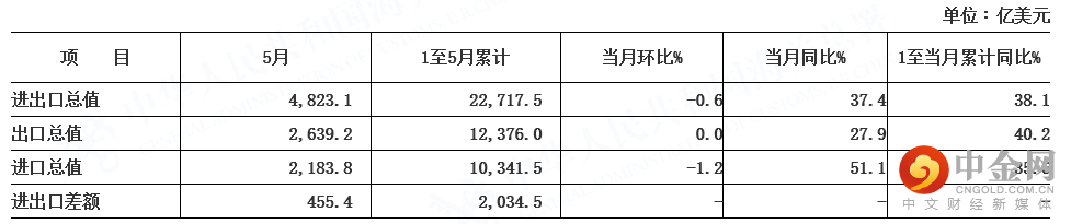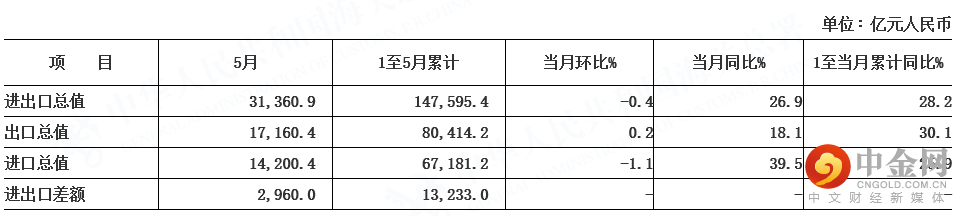 今年前5个月,我国外贸进出口14.76万亿元人民币,同比增长28.2%,月度进出口已连续1年呈现增长态势。以美元计价,中国5月出口同比增长27.9%,预期增长32.1%,前值增长32.3%。以美元计价,中国5月进口同比增长51.1%,预期增长53.5%,前值增长43.1%;进口增51.1%,预期增50.9%,前值增43.1%;贸易顺差455.3亿美元,同比减少26.5%。以人民币计价,中国5月出口同比增长18.1%,预期增长19.5%,前值增长22.2%。中国5月进口同比增长39.5%,预期增长44.2%,前值增长32.2%;进口增39.5%,预期增44.2%,前值增32.2%;贸易顺差2960亿元,同比减少32.1%。