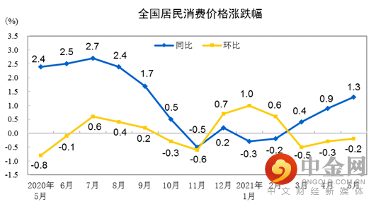 2021年5月份,全国居民消费价格同比上涨1.3%,环比下降0.2%。1--—5月平均,全国居民消费价格比去年同期上涨0.4%。