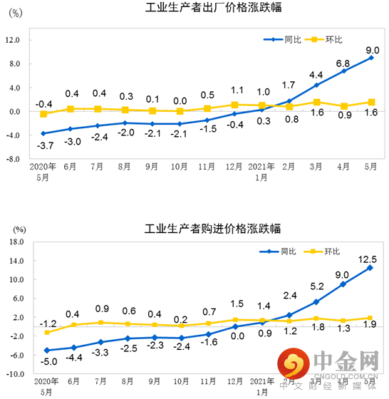 2021年5月份,全国工业生产者出厂价格同比上涨9.0%,环比上涨1.6%;工业生产者购进价格同比上涨12.5%,环比上涨1.9%。1—5月平均,工业生产者出厂价格比去年同期上涨4.4%,工业生产者购进价格上涨5.9%。