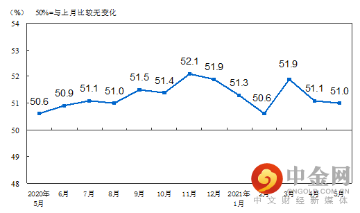5月份,中国制造业采购经理指数(PMI)为51.0%,微低于上月0.1个百分点,继续位于临界点以上,制造业保持平稳扩张。