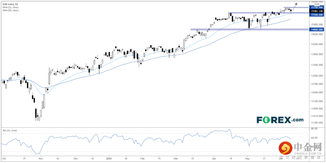 而德国这个基准股指的技术面明显是四者中最强的一个。DAX上周刚刚创下历史新高,周三回撤到由前阻力位转化而来的支撑位15500后回升,更添突破的有效性。RSI尚未进入超买区域,表明只要守住15500,DAX短线就有扩大上行的潜力。Forex