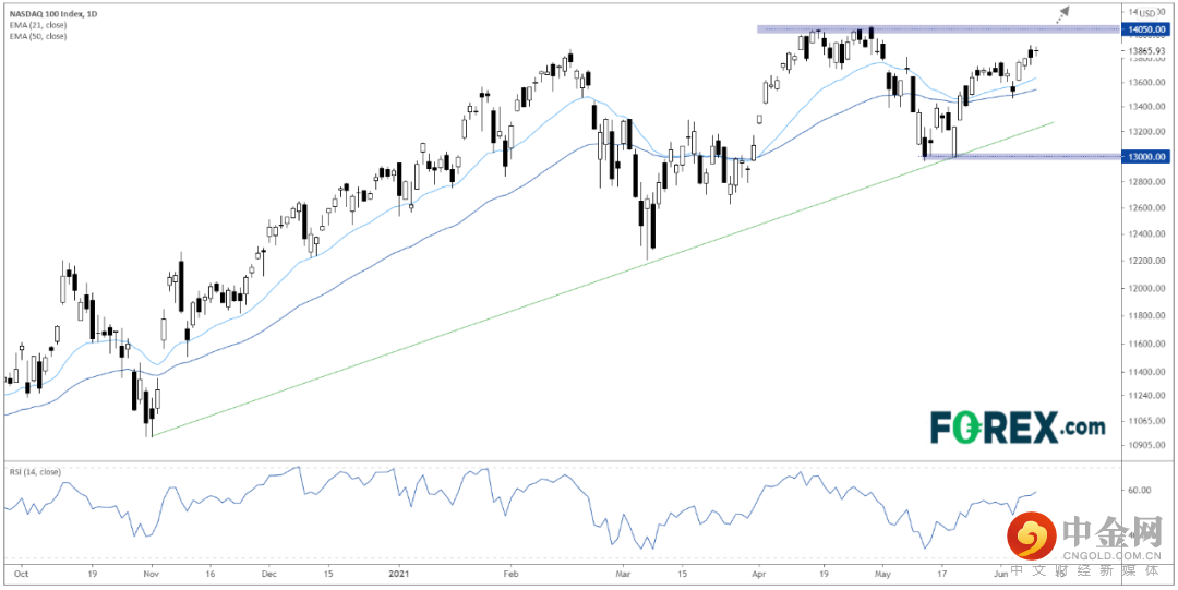 在本文我们所讨论的四大股指中,科技权重股指纳斯达克100指数的技术面可以说是最弱的。价格目前交投于上翘的21和50天指数移动均线上方,但优势不明显,并且RSI今年迄今一直没有触及“超买”区域,表明多头动能一般。在经历数月震荡、反复的交投后,多头需要确定性地站上年内高点14050,才有机会重拾较长期上涨趋势,并打开年内上攻15000的空间。Forex