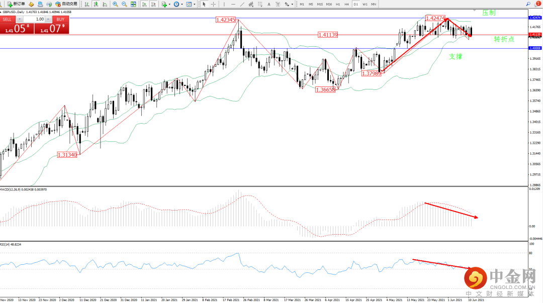 多头动力延续布尔带指标通道中上轨区间持续震荡上扬,高位抵达1.42474附近节点后维持弱势整理中,高位布尔带指标呈收口平移走势持续中,短期或有维持整理后有破下轨迹象,上方压制关注1.42474附近节点,下方支撑关注1.40008附近节点,关注中轨1.41139附近转折点,MACD指标处于多头区域高位维持整理不断下移中,RSI指标处于多头区域维持在50均衡线上侧弱势整理中,如图: