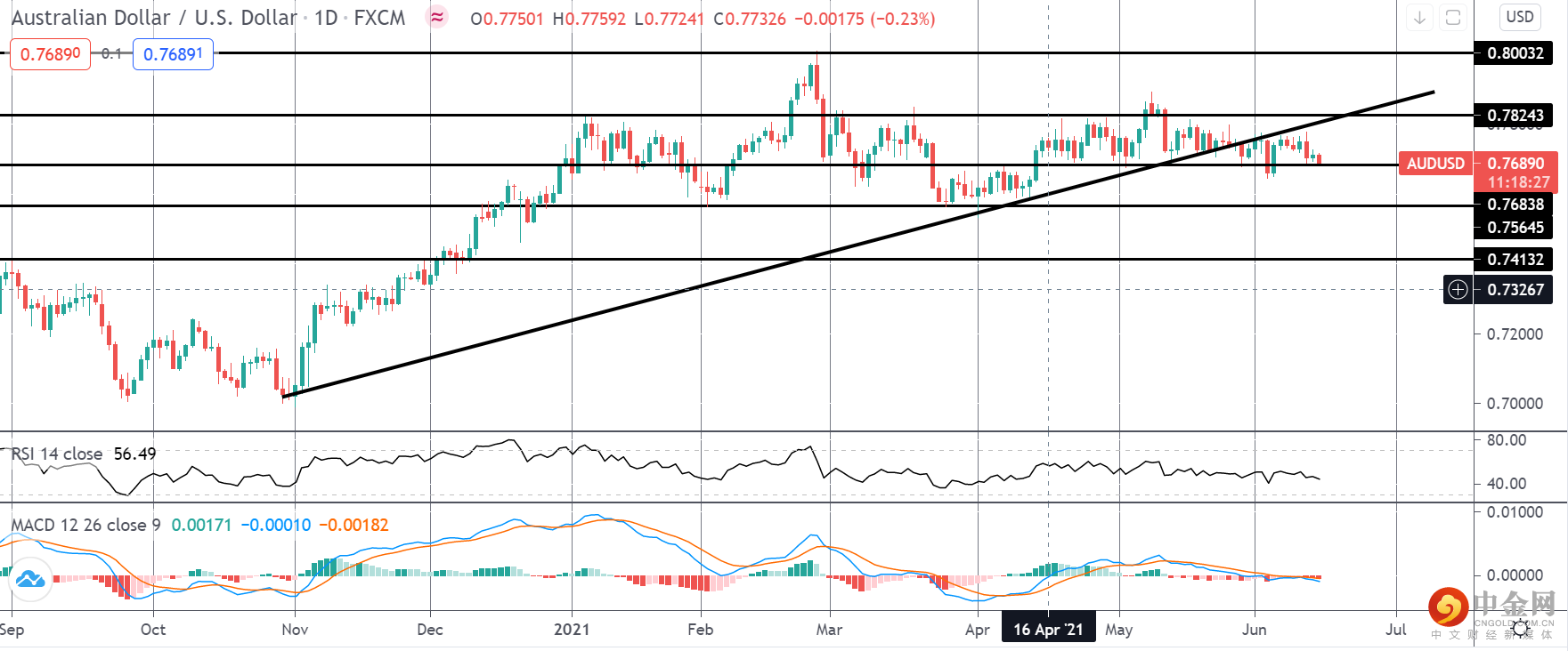 如果今天的美国数据强劲(并且美联储被视为鹰派),这可能会推动美元走高。随后股市和大宗商品价格的回调将打击澳元,为该货币对跌破 0.7683 创造空间,此后目标为 0.7564 和 .7413。