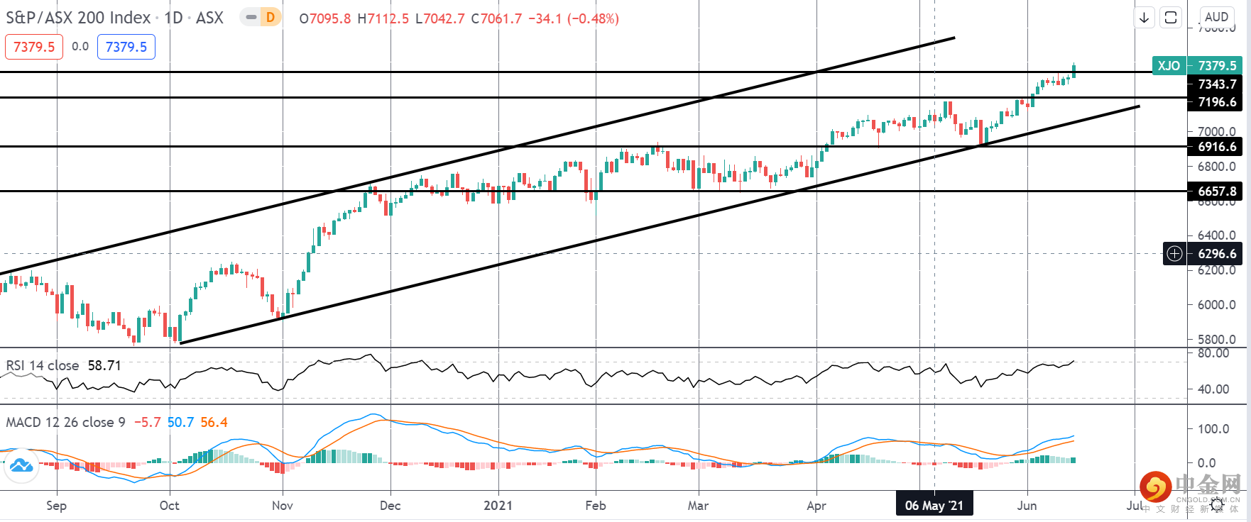 随着牛市通道的进一步发展,ASX 的反弹使该指数突破了 7343.7 的水平。不过 RSI 和 MACD 都看涨,RSI 处于超买区域,MACD 显示看跌背离,警惕任何反转走低。如果价格回到 7343.7 水平以下,7196.6 和上升通道低点是下一个值得关注的支撑区域。