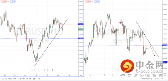 欧美天图:目前行情虽然形成头部状态,并且价格跌破上升趋势线与水平支撑带1.21723附近。但由于美元趋势尚未明确,从日内4小时级别,价格在极端跌破水平支撑后进入调整阶段。可适当关注价格回测上方压制再次受阻的空头机会,下方目标位置参考1.20661一带。