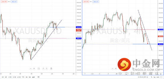 黄金天图:短期价格在冲击上方水平压制带附近再度受阻,由于趋势回落幅度较大,并且有效跌破水平支撑带1874.437附近,以及上升趋势线的支撑作用。从日内4小时级别,其趋势现阶段趋于偏空,上方有下降趋势线的压制作用。可适当关注价格调整后下行的空头机会,下方目标位置参考1843.633一带。