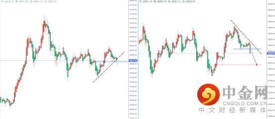 恒生指数天图:短期价格在回测支撑带后走弱,并且有跌破上升趋势线与水平支撑带附近。但整体空头趋势尚未形成,从日内4小时级别,其价格在下降趋势线压制下受阻下行。可关注价格回测压制后走弱的空头机会,但需要注意下方空间幅度,目标位置参考28155.02附近。