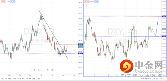 美元指数天图:从近期市场的表现,价格在相对底部区间筑底已经确立。并且正冲击上方水平压制带90.657附近。但由于上方压制较重,从日内4小时级别,其趋势在前期冲击压制后短期受阻。可适当关注价格回测调整后再次起稳的多头机会,上方目标位置参考90.872附近。
