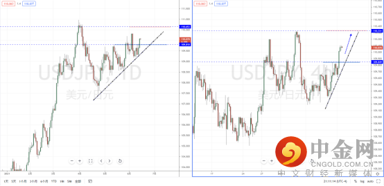 美日天图:短期价格在关键位置附近纠结后继续上行,并且有效突破水平压制带109.810附近。打开短期上方多头空间,但由于整体格局处于在高位阶段,不宜追多行情。从日内4小时级别,适当关注价格回测支撑带后再次起稳上行的多头机会,上方目标位置参考110.331一带。