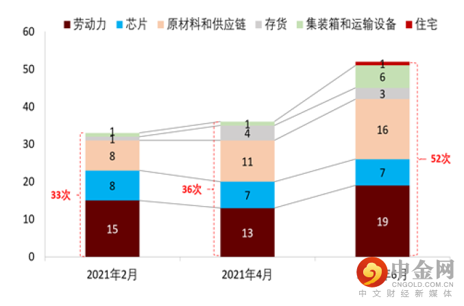 美国劳动力市场的“供需错配”的问题,导致其供给配送效率不断恶化。从各地区联储的调查来看,截至2021年5月,美国的供应配送周期长度已经远远超过疫情前最大值,而且预期未来供应配送效率恶化的企业比例仍然处于历史高位。美联储褐皮书中出现“短缺”的次数越来越多,尤其是提及对劳动力、原材料和供应链以及集装箱和运输设备短缺的次数快速上升。