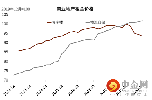 中国商业地产的“甜甜圈”效应也反映了类似的变化。美国的“甜甜圈效应”出现在住宅市场,中国则出现在商业地产市场。在疫情的冲击下,相关业务向线上转移,要素也随之进行再配置,其中的一个体现就是商业地产租金的“甜甜圈效应”。2020年,位于城市中心区的商业地产——写字楼的租金明显下降,而位于郊区的物流仓储租金则一路上行。
