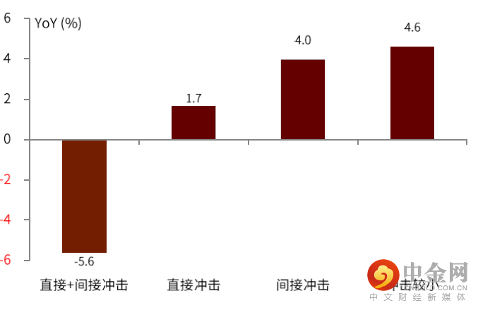 根据上述原则,我们将经济各部门大致分为4类:1)同时受到直接和间接冲击的行业,例如纺织服装、木材加工等生产密接、供应链受海外影响大的行业;2)受直接冲击为主的行业,例如采矿业、建筑业、交通运输、批发零售等生产密接、供应链对外依赖度不高的行业;3)受间接冲击为主的行业,例如石油加工、化工、冶金、电子、电气机械等生产非密接,但供应链对外依赖度较高的行业;4)受冲击较小的行业,例如农林牧渔、专用和通用设备、互联网、金融、科技等生产非密接、供应链受影响较小的行业。[1]