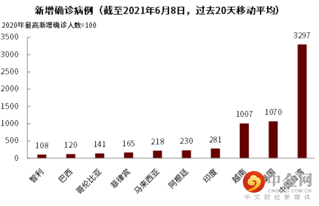 由于供应链紧张的问题迟迟得不到解决,美国似乎面临“无货可卖”的窘境。我们观察到洛杉矶港和新泽西港出口船只的空箱比率不断上升。截至2020年4月,洛杉矶港出口空箱的比率达到69.7%,新泽西港达到66.2%,相比疫情前60%左右的水平大幅提高。此外,也要关注发展中国家疫情对供应链的潜在影响。近期疫情在东南亚、拉丁美洲和南亚地区发展中国家中快速蔓延,同时有报告发现传染力更强的变异毒株,政府为防控疫情加码管控。越南自4月下旬以来确诊病例数仍持续增长,且发现传播性更强,能在空气中迅速传播的毒株,越南当局已关闭数个机场。马来西亚截至6月7日日新增病例超过5000人,从6月1日开始在全国范围内实施全面封锁,同时也发现了变异病毒。巴西卫生部6月8日公布数据显示新增确诊病例52911例,印度新增新冠确诊病例86498例,疫情仍在快速发展。