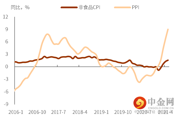 中国PPI大幅上升,非食品CPI也稳步上行。2021年1-5月中国PPI累计上升6%左右,带动5月PPI同比涨幅达到9%,已经超过2017年的高点。诚然,猪肉价格压低了CPI的同比涨幅,上游向下游的价格传导尚不充分,但非食品CPI已经逐步抬头。2021年1-5月非食品CPI累计上涨1.3%,带动其同比涨幅从2020年底的0%上升至2021年5月的1.6%。