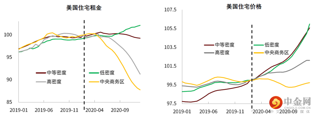 除了“行业再配置”,美国也出现了劳动力“区域再配置”,其住宅市场的“甜甜圈效应”就是佐证。无论是美国的房价还是租金,均出现了市中心地区表现不如郊区的特点。疫情冲击后,数字经济加速发展使得远程办公更为普遍,从而导致高端劳动力从大都市中心撤离,大城市中心地区租金下降,郊区租金上升,市中心房价涨幅慢,市郊房价涨幅快。