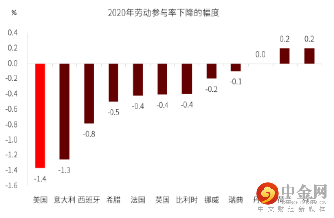 美国劳动力市场存在比中国更为严重的“供需错配”的问题。失业率与职位空缺率居高不下,即“贝弗利奇曲线”(刻画失业率与职位空缺率关系的曲线)明显外移,企业缺工、工人没工作的现象同时存在。当然,美国劳动市场的摩擦不仅受到疫情的冲击,也受到财政刺激的影响。去年3月以来,美国政府共向中低收入居民发放了三轮现金支票,同时向失业者每周额外发放失业补助。一些研究表明,政府提供失业补助过高会降低失业者找工作的动机。过去两个月,美国新增非农就业不及预期,越来越多的企业抱怨“招工难”。我们也注意到,与其它发达国家相比,2020年美国劳动参与率下降的幅度更大,这可能也与美国政府发放的补贴更多有关。