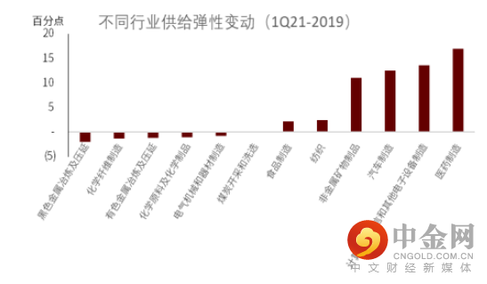 注:供给弹性计算公式为时段内的产能利用率变动/价格变动,本图数据为2021年1季度不同工业企业供给弹性相较2019年的变动