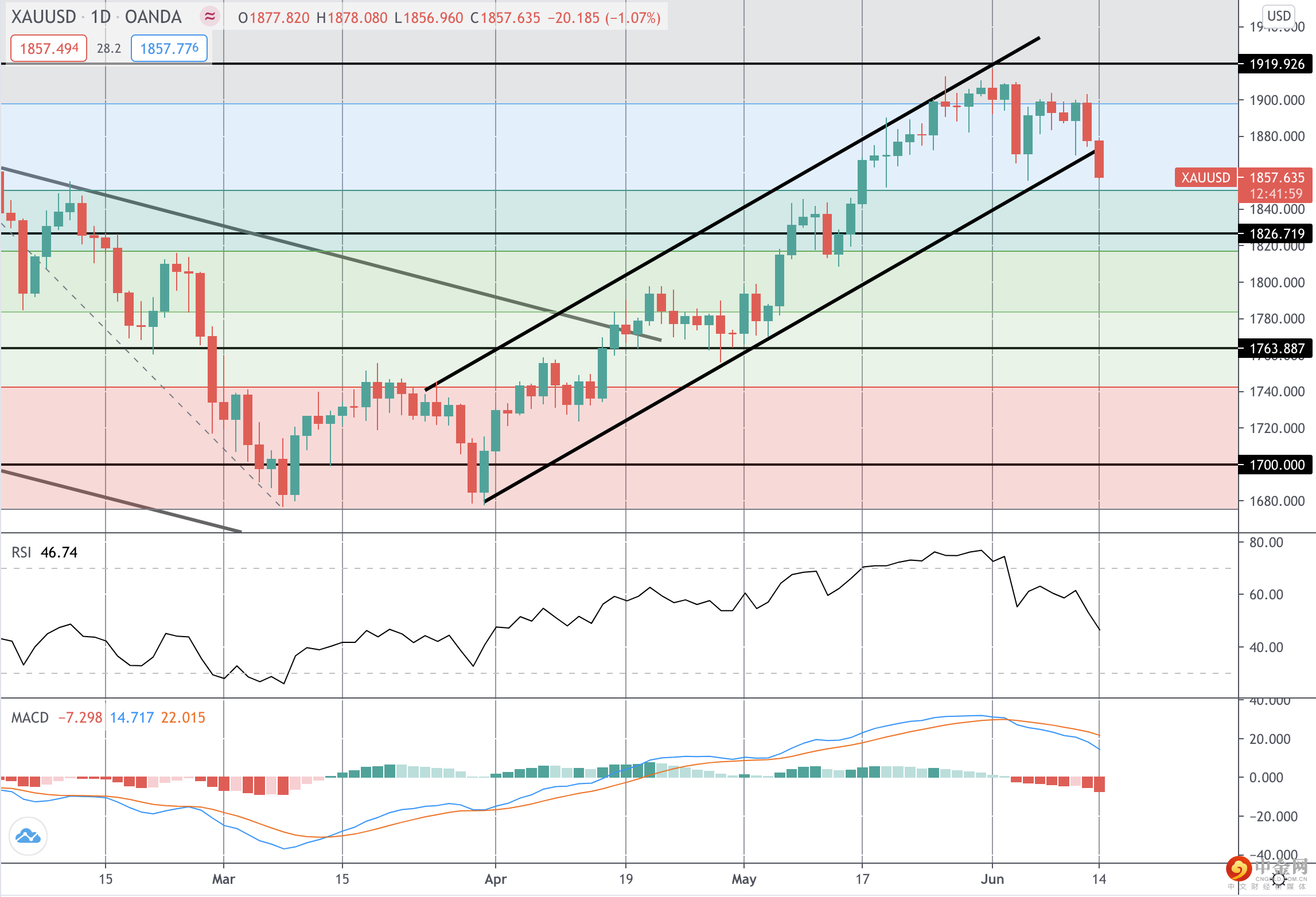 黄金价格的集会被限制在渠道顶部,1919.92级和78.6%的回撤。价格现在在低于频道低下,将焦点转到1826.71支持下一步。在这里的价格下滑,1763.88级是接下来的观看。