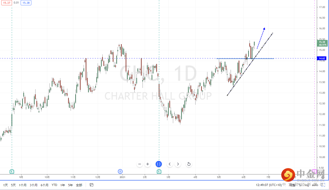 CHC:由于近期市场相对比较清淡,并且各产业之间的分化也比较严重,静等相关数据政策数据的公布。从CHC目前整体趋势的表现,在地产板块持续上行阶段中,使得相关走势势趋于同步上行中。短期价格在回测支撑带14.62附近有起稳上行,下方有上升趋势线的支撑作用。可关注价格小幅调整后继续向上的多头机会,目标位置参考周线前期高点附近。
