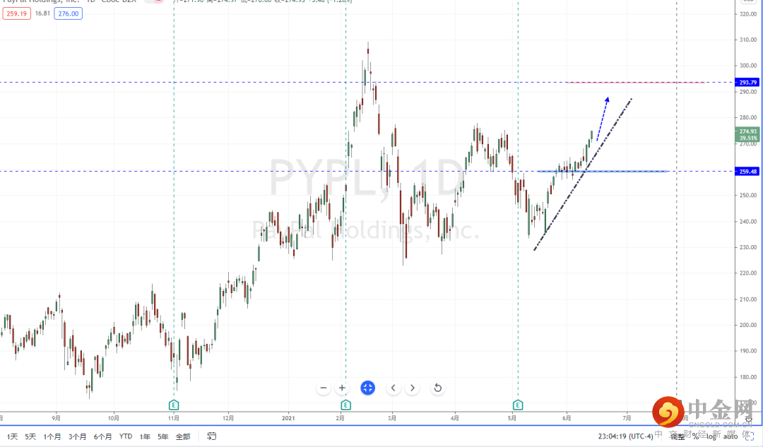 PYPL:由于近期市场分化严重,各产业之间的表现,各不同。市场同时也缺乏有效动能,在等待美联储的相关数据的公布。从PAPL目前趋势在有效突破压制带259.48后继续上行,下方有上升趋势线的支撑作用。可适当关注价格调整后继续上行的多头机会,上方目标位置参考297.79附近。