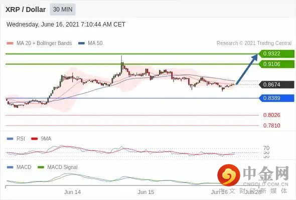 RSI 低于其中性区域 50。MACD 为负值且高于其信号线。配置是混合的。此外,价格交易高于其 20 周期移动平均线 (0.8666),但低于其 50 周期移动平均线 (0.8752)。