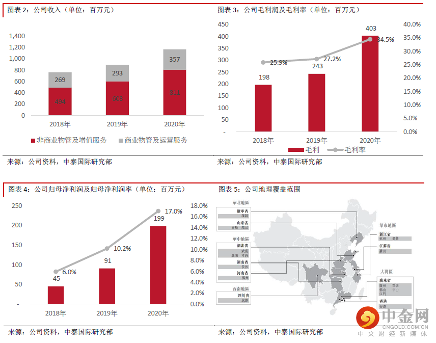 财务分析:2018-2020财年,公司收入分别为人民币7.6亿元、8.9亿元及11.6亿元,其中非商业物管服务的收入占比从64.8.%上升至69.4%,而来自越秀及其关联方提供物管服务产生的收入分别占整体物管服务收入的65.1%、62.9%及66.3%;毛利率分别为25.9%、27.2%及34.5%;归母净利润率分别为6.0%、10.2%及17.0%;经营活动所得现金净额分别为3,848万元、2.0亿元及4.5亿元;非商业物业的保留率分别为100.0%、100.0%及99.1%,管理费收缴率分别为96.0%、94.6%及95.2%。