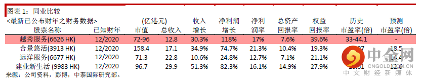 同业比较及估值水平:我们选取3家港股同为商管+住管的企业:合景悠活(3913 HK)、远洋服务(6677 HK)及建业新生活(9983 HK)作为同业比较。估值方面, 2020年公司市盈率约为33-44.1倍,高于同业平均水平24.6倍;21年同业的预测市盈率平均水平约为15.2倍。按全球公开发售后的14.8亿股本计算,公司市值为72-96亿港元。