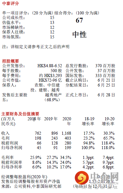 申购建议:大湾区是公司一直重要的战略发展区域,而母公司越秀地产在大湾区拥有大量优质土储,拿地能力突出,我们认为公司背靠母公司的资源优势,未来几年可为自身业绩带来确定性增长,但考虑公司同比相似体量的中型物管公司估值较高且稳价人越秀证券并无参考往绩追踪,若首日破发,跌幅无法预判,综上所述给予其67分,评级为“中性”。