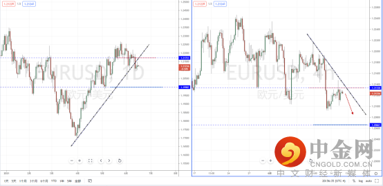 欧美天图:目前行情在头部状态确认下继续纠结,短期价格跌破上升趋势线的支撑作用,上方水平压制带在1021723附近。整体格局处于在偏空阶段中,从日内4小时级别,价格在短期回测压制带附近再次受阻,并且上方有下降趋势线的压制作用,可适当关注价格调整后的空头机会,下方目标位置参考1.20661附近。