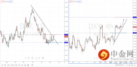美元指数天图:短期价格虽然在继续上行冲击,但依旧受到上方承重的压制阻碍。整体多头格局继续在纠结过程中,上方水平压制带在90.657附近。从日内4小时级别,价格也一直在短期压制带90.592附近受阻。近期可适当关注价格调整后继续上行的多头机会,但需要注意空间幅度,上方目标位置参考90.872一带。