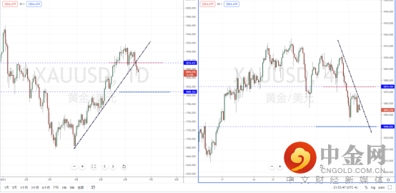 黄金天图:目前行情在头部状态形成后继续走弱,并且价格跌破水平支撑带1847.437附近与上升趋势线的支撑作用。整体格局处于在空头阶段中,从日内4小时级别,价格在上方下降趋势线的压制作用下,继续受阻。可适当关注价格调整后继续走弱的空头机会,下方目标位置参考1840.025附近。