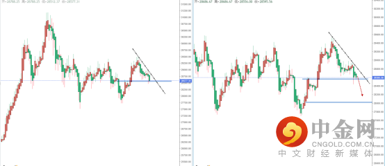 恒生指数天图:目前行情继续处于在回落阶段中,上方有下降趋势线的压制作用,短期支撑带在28514.16附近。整体格局趋于偏空,从日内4小时级别,上方有下降趋势线的压制作用,可关注价格调整后继续走弱的空头机会,下方目标位置参考28261.71附近。