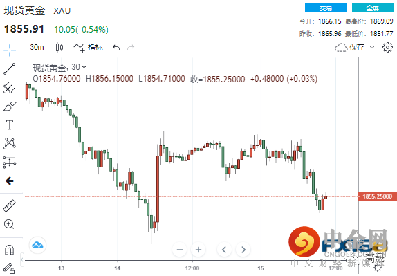 现货黄金收报1858.62美元/盎司,下跌7.34美元或0.39%,盘中一度触及1869.09美元/盎司高点,但随后大幅回落逾17美元至1851.77美元/盎司低点,尾盘自低位有所回升。