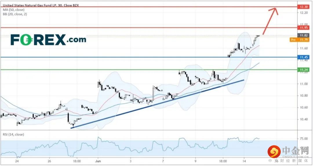 顶头阻力位在11.95美元,此位一破,基金将向另一上行目标12.30美元进发。看涨的只要主要支持 (止损) 位已再上调至11.45美元。
