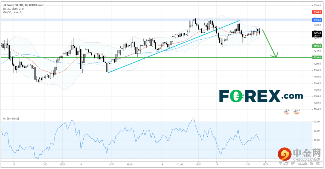 只要位于7,335点的主要阻力 (止损) 位守在上方,英国原油CFD可能回落至支持位7,255点和7,220点作调整目标。