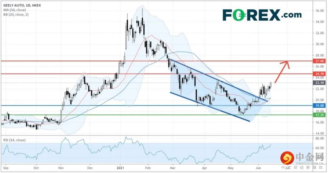 从技术角度看,如日线图所示,吉利汽车可望延续反弹势头。它升破了下降楔形型态,并上破了20日及50日移动均线,发出看涨讯号。