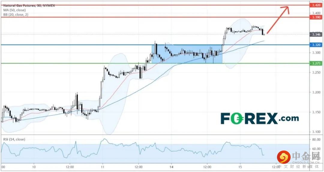 天然气期货价格已经触及我们昨日所定的上行目标3.330美元和3.350美元,看涨的主要支持 (止损) 位已再上调至3.320美元。只要此位不破,天然气期货价格应向上方3.390美元和3.420美元进发。