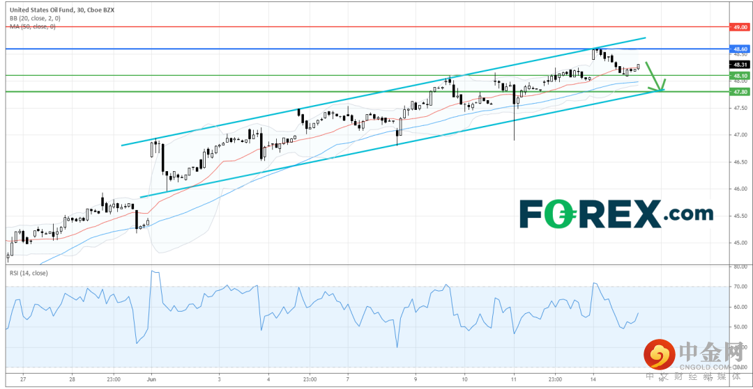 在30分钟图上,美国石油基金 (U.S. Oil Fund,美股编号 : USO) 在上行通道的顶部回落,并进入短期的整固状态。