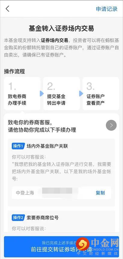 第三步:退出蜻蜓点金app,以在支付宝中提交转托管申请为例(银行类似)。在支付宝直接点进持有的基金资产详情页拉到最下方选择“转场内交易”: