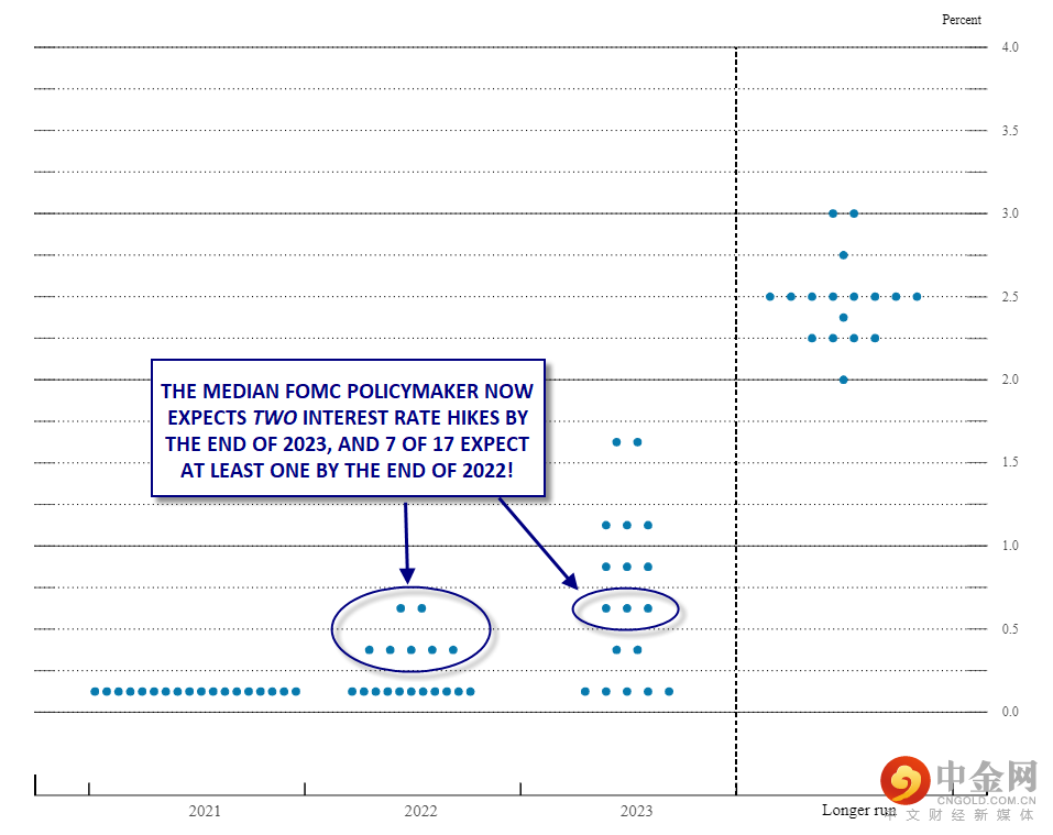 FOMC预测中位值现在认为2023年年末之前有两次加息,而上次会议的中位值为零。
