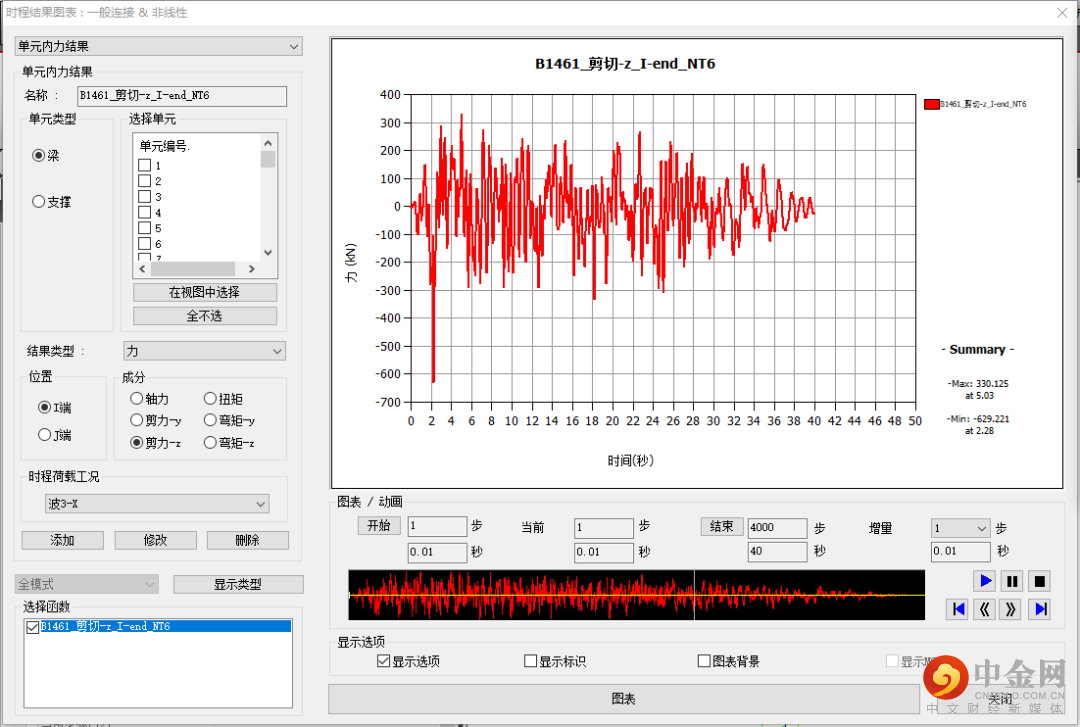(1)利用时程图形得到某单元任意时刻剪力:时程图表/文本>时程图表>单元内力图