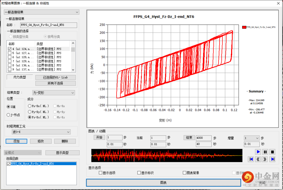 (3)快速查看各非线性边界某一时刻的内力状态或恢复力曲线:时程图表/文本>时程图表>一般连接图表