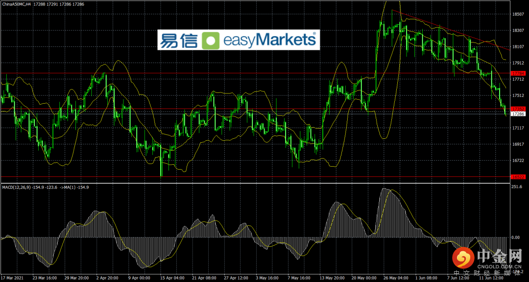技术上看A50指数目前持续回落,17350第一支撑被击破后,后续支撑可能是17000,16500附近,而上方,17350/17700形成关键压力区域。指标看布林线开口向下,MACD走低。交易策略,考虑到上方压力重要性,尝试逢高空交易策略,突破压力则空头离场。