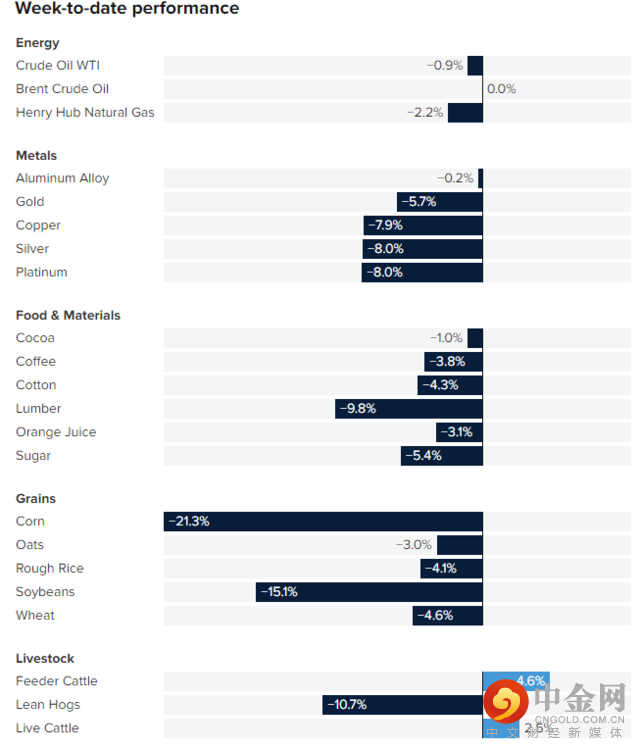 根据CNBC统计,如果将时间轴拉长至本周的话,几乎所有主要大宗商品的价格均出现了下跌,其中玉米和大豆录得两位数跌幅。大豆期货已经抹去了2021年的涨幅,较5月的八年高点下跌超过20%。本周截止目前,大豆基金累跌超12%,如果跌幅保持,将创下纪录以来最大单周跌幅。木材下跌接近10%。而其他主要品种的跌幅也大多超过4%。