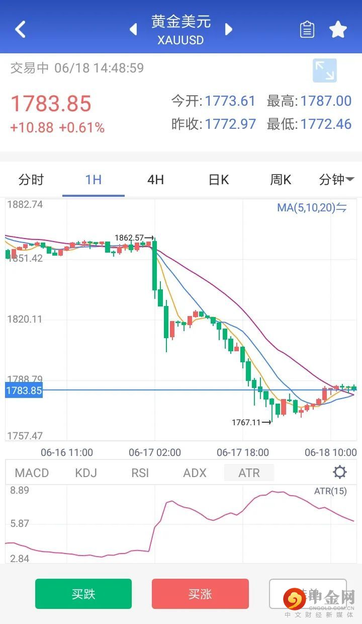 周四,现货金银再度遭遇暴击,亚盘中黄金一度反弹至1820美元上方,随即掉头向下,接连跌破6大关口、最低触及1767美元附近,较日高跌去近60美元;现货白银也失守26关口。截至收盘,现货黄金收跌2.08%,报1772.97美元/盎司,为近7周来最低。两天时间,从1860附近跌至1760附近,近100点的跌幅,现货黄金遭“血洗”,空头大展身手,并且期间并未出现有力反弹,代表市场看空情绪高昂。今天亚洲交易时段,市场情绪平淡,亚股涨跌不一,美元持续反弹逼近92关口,现货黄金在连续两日暴跌后试图企稳。