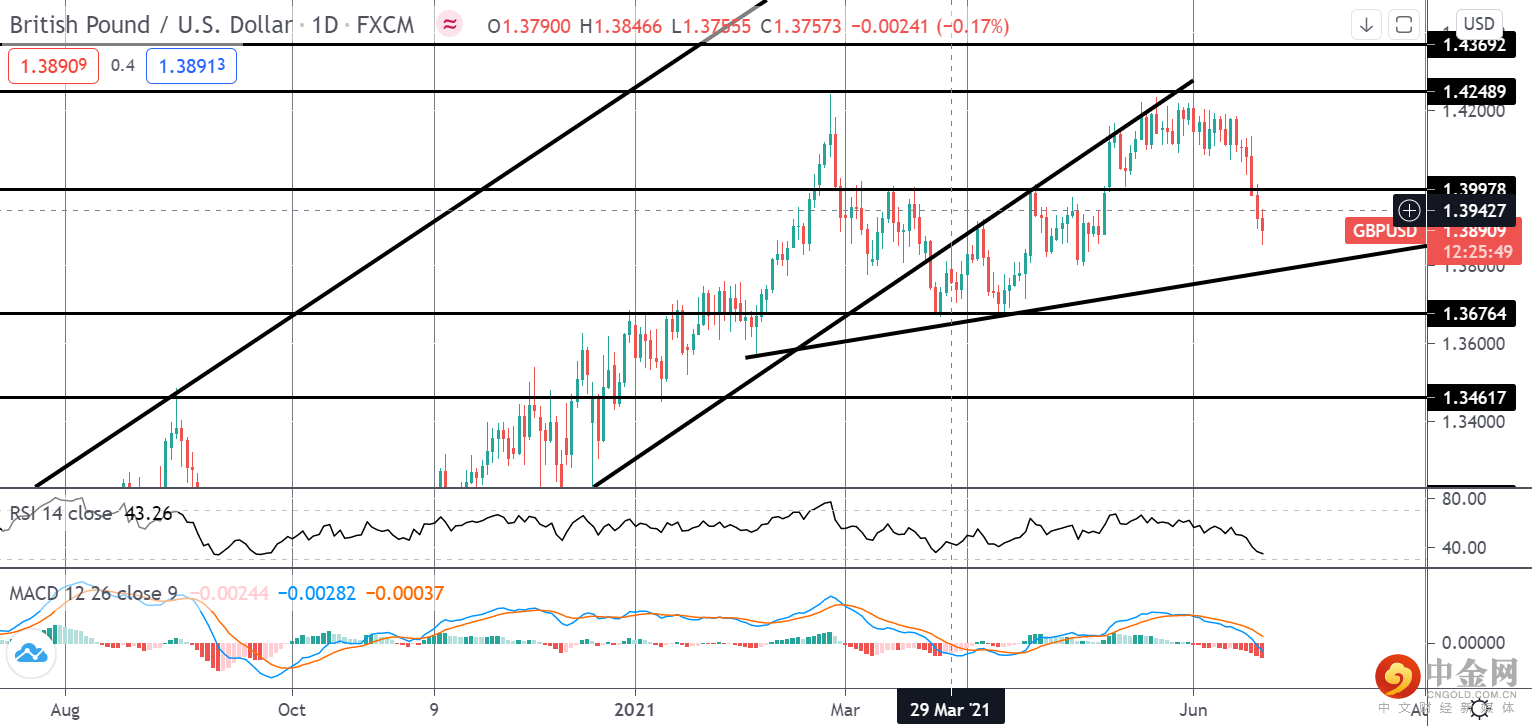 最近在高位盘整,RSI 出现看跌背离,MACD 在价格跌破前转为看跌。抛售使价格跌破 1.3997 水平,目前接近当地上升趋势线支撑。在那里,1.3676 水平是下一个需要注意的关键支撑。
