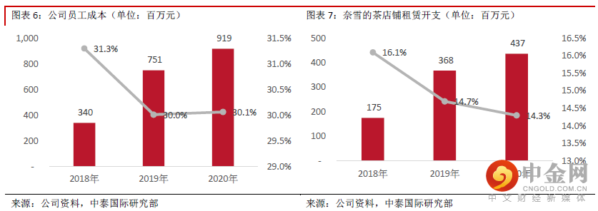 率分别为24.9%及25.3%,保持稳定水平,而2019年及2020年相同门店的利润率受到疫情的影响由21.0%下降至13.5%,而2020年下半年同店利润率已回升至17.3%。此外从开设新店类型来看,650间新店中约70%将规划为奈雪PRO茶饮店。奈雪PRO茶饮店每间店的店面面积约80-200平方米,低于标准茶饮店店面面积180-350平方米;店员方面,平均数量约为13名,少于同期标准茶饮店的平均数目22名。在目前现有的店铺组合中,仅有约12%比例是奈雪PRO茶饮店,未来随着PRO茶饮店在店面组合中的比例持续提升,预计或将改善单店的经营效率。
