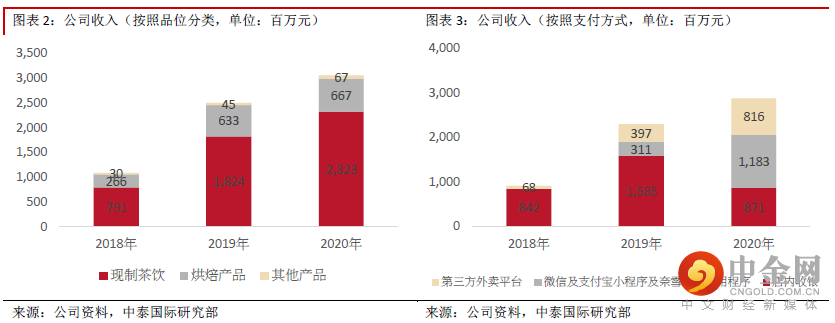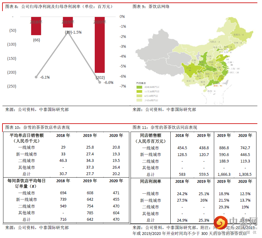 财务分析:2018-2020财年,公司收入分别为人民币10.9亿元、25亿元及30.6亿元,来自茶饮的收入占比接近7至8成,而来自烘焙产品的收入占比接近两成,茶饮收入中接近9成由 “奈雪的茶”贡献,其余收入贡献为子品牌“台盖”;公司于2019年9月推出奈雪的茶会员体系,注册会员人数由2019年底的930万名大幅增长至2020年底的2,790万名,2020年奈雪的茶订单总数中约49.0%来自奈雪的茶会员。此外2020年第四季度的活跃会员人数达580万人,其中近3成为复购会员;毛利率分别为64.7%、63.4%及62.1%;员工成本分别占比总收入31.3%、30%及30.1%;奈雪的茶店铺层面的租赁开支等于奈雪的茶茶饮店使用权资产折旧以及其他租金及相关开支的总和,分别为16.1%、14.7%及14.3%,持续下跌主要是由于品牌知名度提升及店铺议价能力提升,新茶饮店租金减少;广告及推广开支占比总收入3.6%、2.7%及2.7%;亏损分别为6,600万元、3,855万元及2亿元;经营活动所得现金净额分别为2亿元、4.2亿元及5.7亿亿元;年末现金及现金等价物为1.9亿元、8,130万元及5亿元。