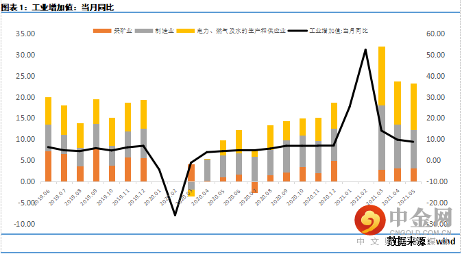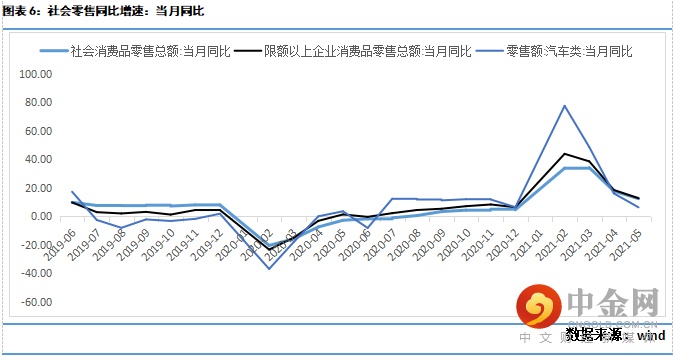 5月工业生产稳中有落,与我们观察到的部分行业生产放缓以及PMI生产指标回落相互印证,表明工业生产有所放缓。可能有以下几个方面的原因,一是PMI新订单、新出口订单指数回落显示需求有所放缓,拖累工业生产;二是,国内环保、安检趋严,上游开采、冶炼等行业开工受限较多;三是,部分原料缺失制约工业生产,比如“缺芯”问题突出影响汽车开工。往后看,我们认为内外需均出现了放缓的迹象,可能会继续拖累后续的生产,同时,由于原料涨价问题突出,可能会带来生产的分化,上游开工积极性可能要好于下游。